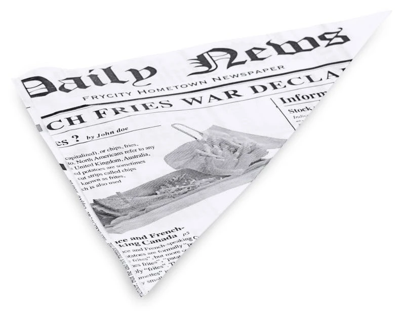 Pommes frites-Tüte, spitze Form, aus fettdichtem Papier, bedruckt im Stil einer englischen Zeitung