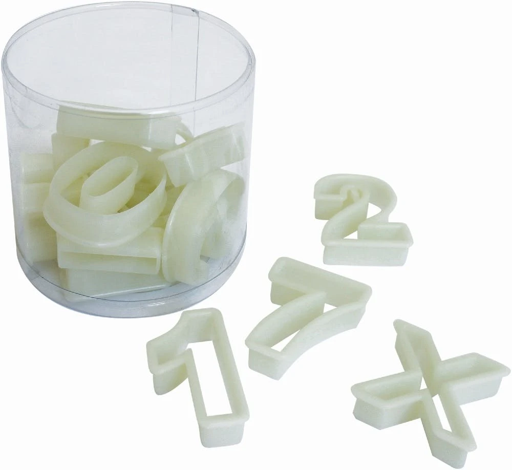 Hochwertiger Ausstechersatz aus Nylon in praktischer Aufbewahrungsdose. Die Ausstecher sind hitzebeständig bis +160°C. ++ Ausführung ++ Zahlen ++ Anzahl Stück ++ 15 ++ Abmessungen / ++ Durchmesser (mm) ++ 15, 60 x 45 ++ Höhe (mm) ++ 35 ++