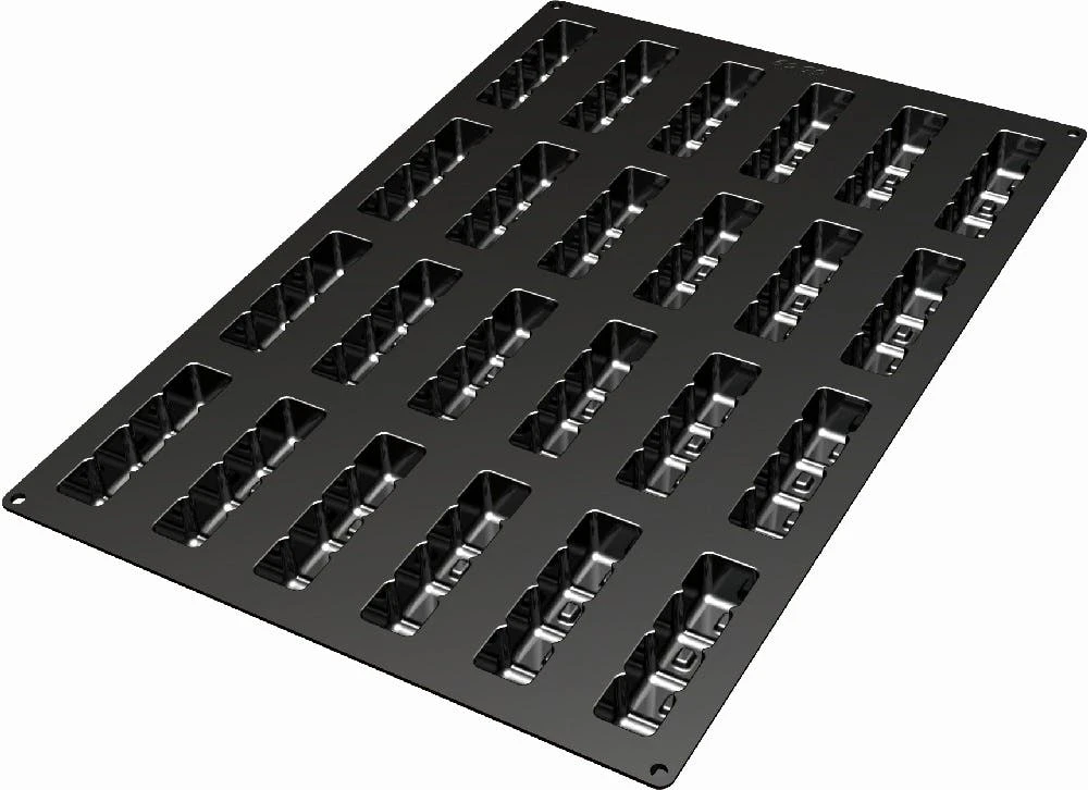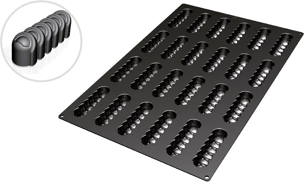 Diese Silikonbackform ist geeignet von -60 bis +230°C und kann in Backöfen, Mikrowellen und Gefrierschränken verwendet werden. ++ Ausführung: Fantasy 5 ++ Maße: 400 x 600 mm ++ Nutzen: 24 (118 x 30 mm) ++ Höhe: 32 mm ++ Volumen: 103 ml/Nutzen