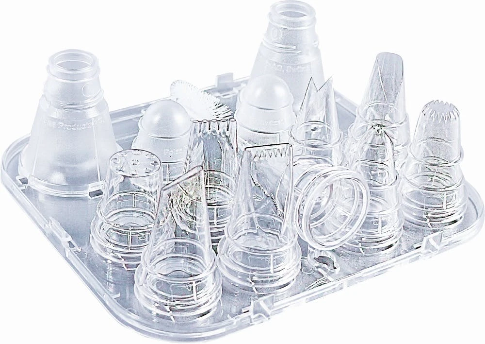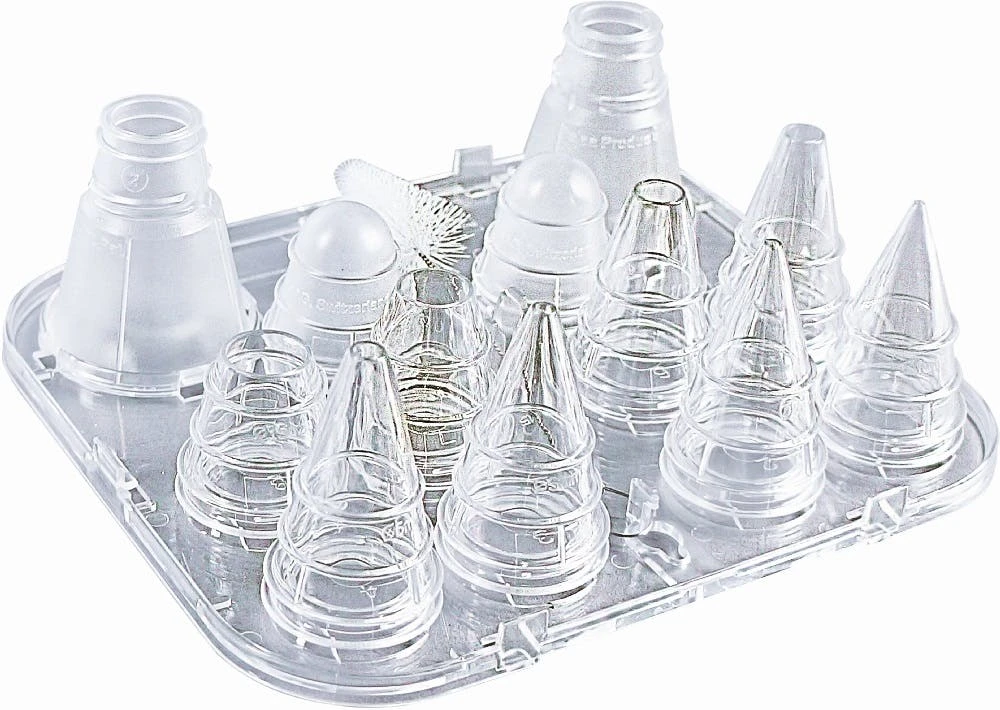 Tüllenkassetten-Set “Multi-Deko” ++ Material: BPA-frei ++ Farbe glasklar ++ Höhe: ca. 3,0 – 5,0 cm ++ Wandmontage möglich ++ Inkl. Deckel für hygienische Aufbewahrung ++ Spülmaschinengeeignet ++ Inhalt: 8 franz. Sterntüllen, 2 Adapter, 2 Verschlüsse, 1 Tüllenbürste ++