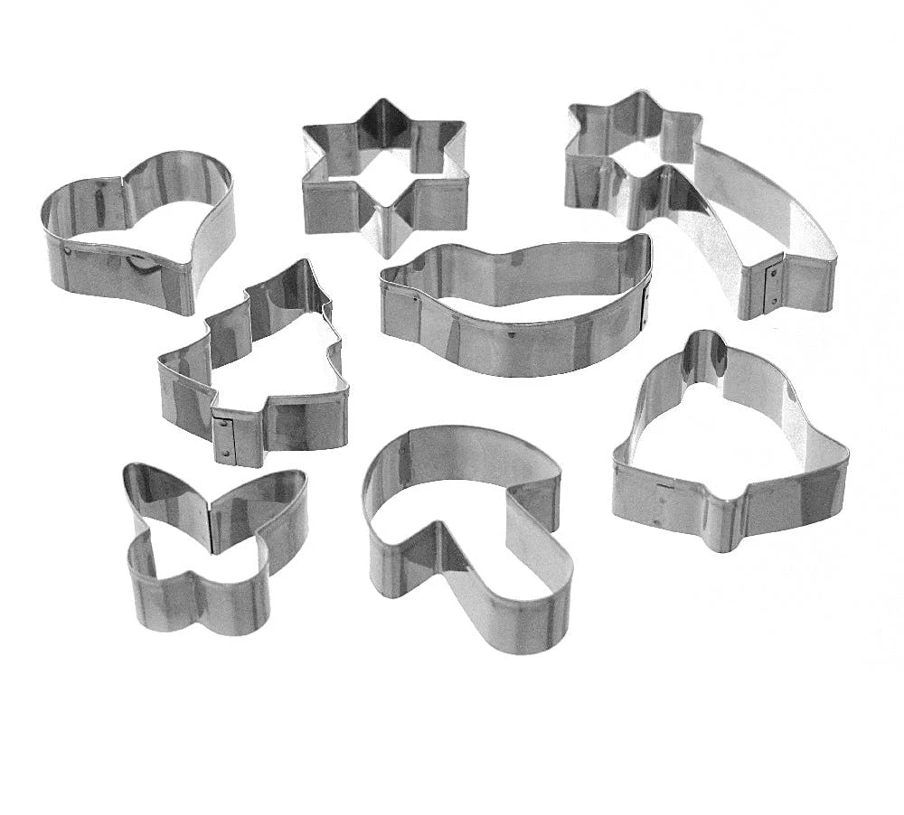 10-teiliges Ausstecher-Set aus Edelstahl. ++ Ausführung: Weihnachtsausstecher glatt ++ Materialstärke (mm): 0,3 ++ Abmessungen (mm): 50 ++ Inhalt: 10 Motive ++