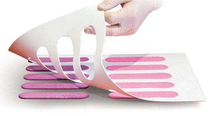 Matte aus flexiblem Silikon in Lebensmittelqualität mit perfekten und präzisen Formen, die für Schokolade entwickelt wurden aber auch für Isomalt, Karamell und andere Massen geeignet sind mit denen Sie die Produktion einfach anpassen können. Auf der Matte sind 99 Stück à 20 mm Durchmesser. Mattenmaß: 390 x 290 x 1,5 mm