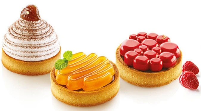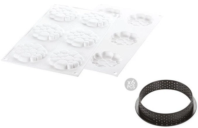 Das Set besteht aus zwei Elementen: sechs Ringe aus thermoplastischem, bruchsicherem Verbundmaterial, das zum Backen und Herstellen der Basis geeignet ist, und einer Silikonform zur Herstellung einer Mousse oder einer Creme, die über die Mürbeteigbasis gelegt wird. Die Ringe sind antihaftend und rostfrei, ermöglichen ein homogenes Backen und zeichnen sich durch eine hohe thermische Stabilität aus.