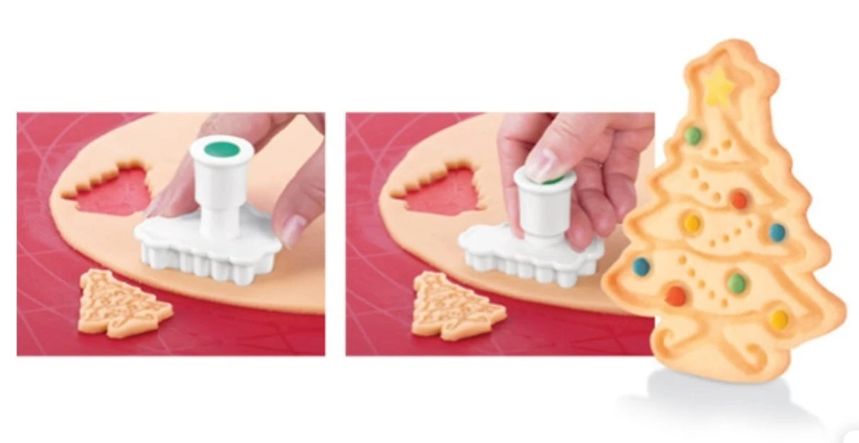 Vier Ausstecher DELÍCIA für die leichte Zubereitung von originellen weihnachtlichen Keksen, Linzer Plätzchen und Lebkuchen sowie zum Dekorieren von Marzipan mit Stempel.